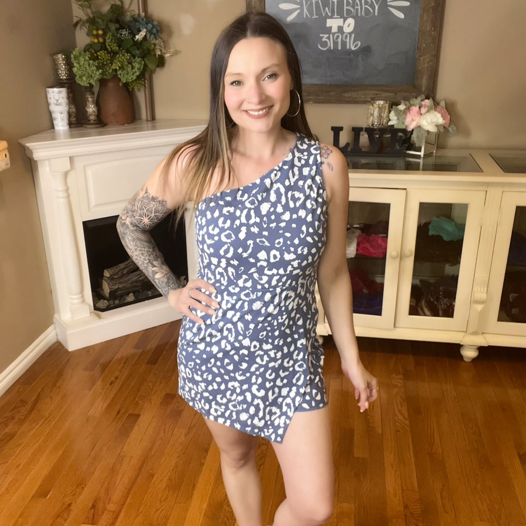 One shoulder romper with semi fitted bodice and zipper closure on back. Non sheer, stretchy.