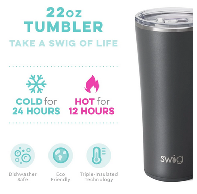 Thanks to our triple insulation technology, this tumbler keeps drinks cold for up to 24 hours and hot up to 12 hours. The cup holder friendly, slim shape makes it perfect on the go or at home. From sweet tea to hot toddy's, this Swig will definitely be your new fave!